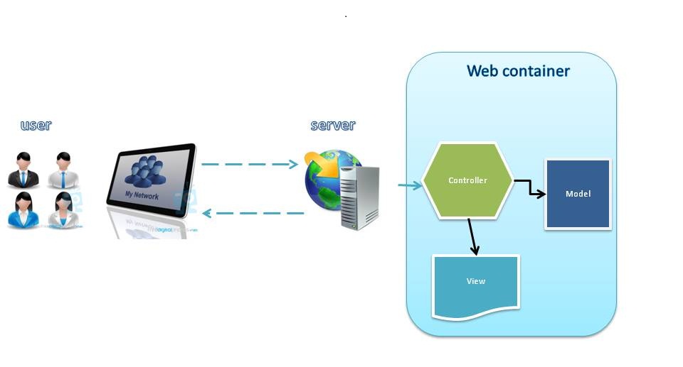 早期因為JSP語法容易和前端HTML混在一起使用,而造成開發與維護上的困難與除錯難度高,所以漸漸衍生出MVC的軟體設計模式出現。MVC全名為Model-View-Controller,也就是說把一個系統分為檢視(View)、模型(Model)和控制器(Controller)。 下圖中可以說明了使用者與MVC架構之間的關係,當使用者一開始連線到伺服器時,出現預設的畫面,然後會根據使用者的想法,控制器會去做出使用者可預期的動作,例如:今天A君要輸出年度預算報表時,控制器會根據"這個需求"指派給預算模型去做計算並得到結果,再由控制器將結果回覆給前端的檢視介面。